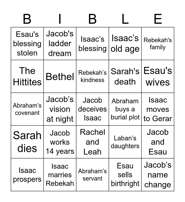 This bingo card has 25 words: Sarah dies, Isaac marries Rebekah, Jacob deceives Isaac, Esau sells birthright, Rebekah's family, Esau's blessing stolen, Jacob's ladder dream, Isaac’s blessing, Abraham buys a burial plot, Jacob and Esau, The Hittites, Bethel, Abraham’s servant, Laban’s daughters, Esau's wives, Isaac prospers, Jacob’s vision at night, Rebekah’s kindness, Sarah's death, Isaac moves to Gerar, Abraham’s covenant, Jacob works 14 years, Rachel and Leah, Isaac’s old age and Jacob’s name change.