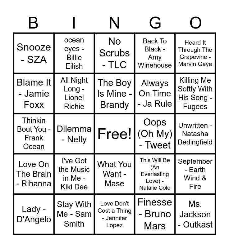This bingo card has a free space and 97 words: No Diggity - Blackstreet, MILLION DOLLAR BABY - Tommy Richman, Frontin' - Pharrell Williams, Dilemma - Nelly, Stop! In The Name Of Love - The Supremes, The Way I Are Timbaland, I've Got a Woman - Ray Charles, Lalala - BBNO$, I Do (Cherish You) - 98°, Do You Love Me - The Contours, It's Not Right But It's Okay - Whitney Houston, Billie Jean - Michael Jackson, Rolling in the Deep - Adele, Love On The Brain - Rihanna, Blurred Lines - Robin Thicke, Snooze - SZA, Heard It Through The Grapevine - Marvin Gaye, At Last - Etta James, This Is How We Do It - Montell Jordan, Yo - Chris Brown, My Girl - The Temptations, Don't Let Go - En Vogue, My Boo - USHER, Redbone - Childish Gambino, How Do I Breathe - Mario, The Boy Is Mine - Brandy, Lady - D'Angelo, September - Earth Wind & Fire, Glamorous - Fergie, Peaches & Cream - 112, All Night Long - Lionel Richie, Back To Black - Amy Winehouse, Say My Name - Destiny's Child, 1 2 Step - Ciara, Love Don't Cost a Thing - Jennifer Lopez, What You Want - Mase, Dancing In The Street - Martha & The Vandellas, Genie In a Bottle - Christina Aguilera, I Will Survive - Gloria Gaynor, Thinkin Bout You - Frank Ocean, So Sick - Ne-Yo, Unwritten - Natasha Bedingfield, All For You - Janet Jackson, Finesse - Bruno Mars, I've Got the Music in Me - Kiki Dee, Candy Rain - Soul For Real, Feels Good - Tony! Toni! Toné!, Doo Wop - Ms. Lauryn Hill, Super Freak - Rick James, Trip - Ella Mai, Respect - Aretha Franklin, Blinding Lights - The Weeknd, Don't Wanna Go Home - Jason Derulo, Family Affair - Mary J. Blige, Upside Down - Diana Ross, Uh Huh - B2K, Move Ya Body - Nina Sky, ocean eyes - Billie Eilish, I Wanna Love You - Akon, I'll Make Love To You - Boyz II Men, Put Your Records On - Corinne Bailey Rae, Trick Me Radio Mix - Kelis, Best of My Love - The Emotions, Just the Two of Us - Grover Washington, Please Mr. Postman - The Marvelettes, Love Machine - The Miracles, Bad Habit - Steve Lacy, Water - Tyla, He Wasn't Man Enough - Toni Braxton, Stay With Me - Sam Smith, Always On Time - Ja Rule, Crazy - Gnarls Barkley, Halo - Beyoncé, Signed Sealed Delivered - Stevie Wonder, Buy U a Drank - T-Pain, One In A Million - Aaliyah, Location - Khalid, Work It - Missy Elliott, Oops (Oh My) - Tweet, Somebody's Watching Me - Rockwell, Forever Your Girl - Paula Abdul, Killing Me Softly With His Song - Fugees, I Want You Back - The Jackson 5, 1 Thing - Amerie, We Belong Together - Mariah Carey, No Role Modelz - J. Cole, Ms. Jackson - Outkast, Easy - Commodores, I Just Wanna Love U - JAY-Z, Love Like This - Faith Evans, No Scrubs - TLC, Never Leave You - Lumidee, Poison - Bell Biv DeVoe, This Will Be (An Everlasting Love) - Natalie Cole, Blame It - Jamie Foxx, Where the Party At - Jagged Edge and Fallin' - Alicia Keys.