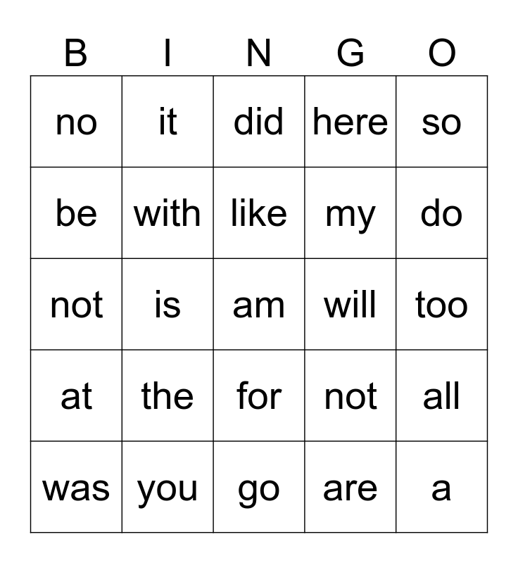 This bingo card has a free space and 24 words: the, you, like, was, so, no, be, it, will, for, my, not, not, all, with, are, too, did, do, is, a, at, here and go.