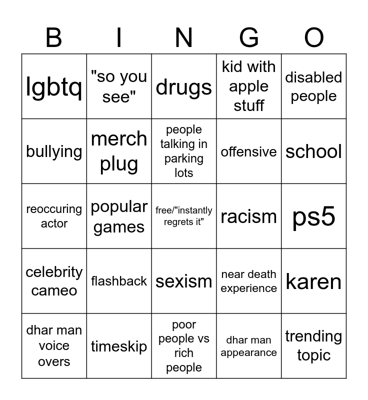 This bingo card has a free space and 24 words: flashback, timeskip, people talking in parking lots, dhar man voice overs, disabled people, lgbtq, bullying, "so you see", racism, sexism, offensive, reoccuring actor, near death experience, karen, merch plug, dhar man appearance, ps5, drugs, school, popular games, trending topic, celebrity cameo, kid with apple stuff and poor people vs rich people.