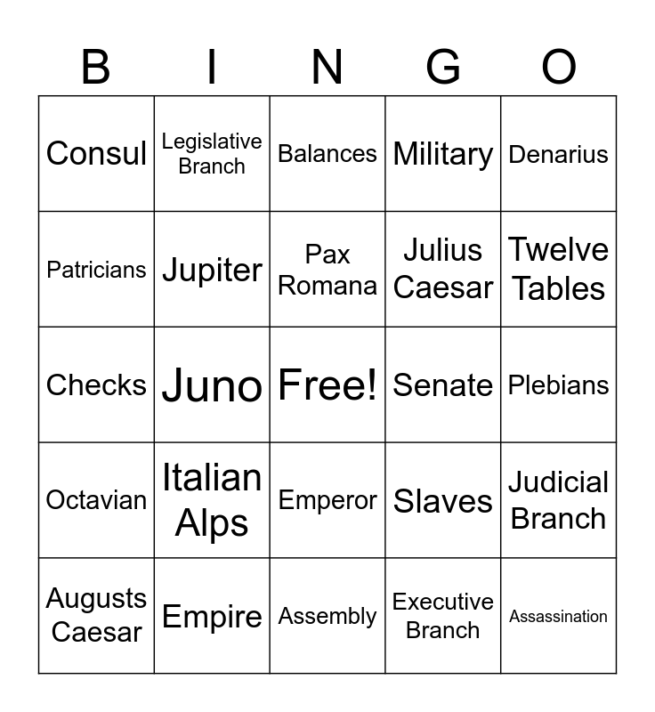 This bingo card has a free space and 24 words: Italian Alps, Empire, Pax Romana, Augusts Caesar, Denarius, Consul, Patricians, Legislative Branch, Senate, Emperor, Julius Caesar, Checks, Slaves, Judicial Branch, Jupiter, Executive Branch, Plebians, Balances, Twelve Tables, Juno, Assassination, Octavian, Military and Assembly.