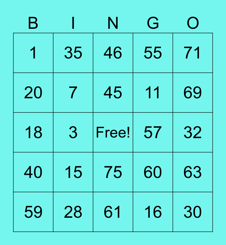 This bingo card has a free space and 24 words: 15, 28, 45, 59, 71, 1, 20, 35, 57, 75, 11, 18, 60, 63, 7, 16, 32, 46, 69, 3, 30, 40, 55 and 61.