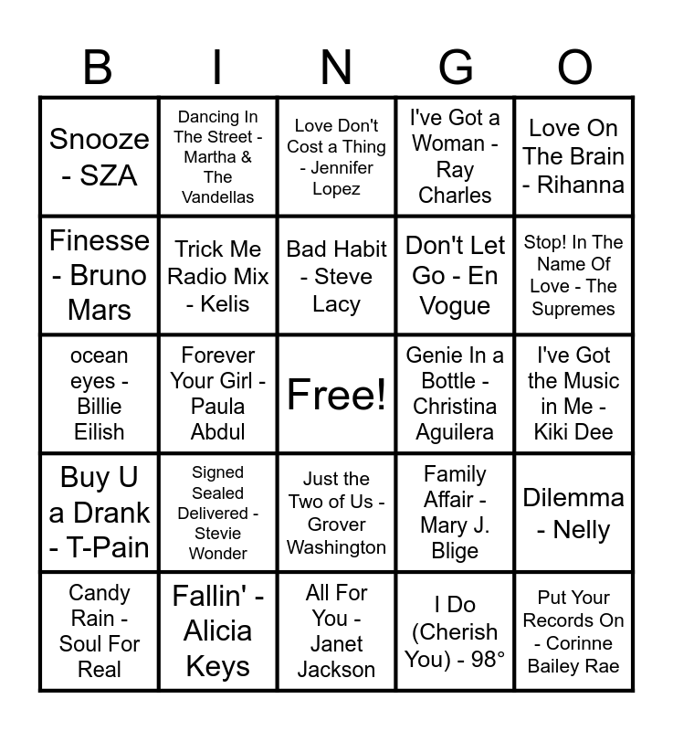This bingo card has a free space and 97 words: Do You Love Me - The Contours, Heard It Through The Grapevine - Marvin Gaye, My Girl - The Temptations, Forever Your Girl - Paula Abdul, Somebody's Watching Me - Rockwell, One In A Million - Aaliyah, Yo - Chris Brown, Easy - Commodores, Glamorous - Fergie, Halo - Beyoncé, No Role Modelz - J. Cole, 1 2 Step - Ciara, Peaches & Cream - 112, Buy U a Drank - T-Pain, I Wanna Love You - Akon, Snooze - SZA, Love On The Brain - Rihanna, My Boo - USHER, The Way I Are Timbaland, The Boy Is Mine - Brandy, I Want You Back - The Jackson 5, I'll Make Love To You - Boyz II Men, Location - Khalid, Where the Party At - Jagged Edge, Trip - Ella Mai, Bad Habit - Steve Lacy, Candy Rain - Soul For Real, Dilemma - Nelly, Love Machine - The Miracles, Thinkin Bout You - Frank Ocean, Trick Me Radio Mix - Kelis, I've Got a Woman - Ray Charles, Don't Wanna Go Home - Jason Derulo, Poison - Bell Biv DeVoe, All For You - Janet Jackson, Just the Two of Us - Grover Washington, It's Not Right But It's Okay - Whitney Houston, Uh Huh - B2K, Doo Wop - Ms. Lauryn Hill, ocean eyes - Billie Eilish, Rolling in the Deep - Adele, I've Got the Music in Me - Kiki Dee, Respect - Aretha Franklin, I Do (Cherish You) - 98°, Signed Sealed Delivered - Stevie Wonder, Never Leave You - Lumidee, This Is How We Do It - Montell Jordan, September - Earth Wind & Fire, Stay With Me - Sam Smith, How Do I Breathe - Mario, Killing Me Softly With His Song - Fugees, Unwritten - Natasha Bedingfield, Blinding Lights - The Weeknd, Say My Name - Destiny's Child, I Just Wanna Love U - JAY-Z, Redbone - Childish Gambino, Crazy - Gnarls Barkley, Dancing In The Street - Martha & The Vandellas, Lady - D'Angelo, Feels Good - Tony! Toni! Toné!, Oops (Oh My) - Tweet, Upside Down - Diana Ross, No Diggity - Blackstreet, Move Ya Body - Nina Sky, This Will Be (An Everlasting Love) - Natalie Cole, All Night Long - Lionel Richie, So Sick - Ne-Yo, Water - Tyla, 1 Thing - Amerie, Fallin' - Alicia Keys, Don't Let Go - En Vogue, Best of My Love - The Emotions, Lalala - BBNO$, Blurred Lines - Robin Thicke, I Will Survive - Gloria Gaynor, Ms. Jackson - Outkast, He Wasn't Man Enough - Toni Braxton, Always On Time - Ja Rule, Genie In a Bottle - Christina Aguilera, Work It - Missy Elliott, What You Want - Mase, Stop! In The Name Of Love - The Supremes, Blame It - Jamie Foxx, Please Mr. Postman - The Marvelettes, Billie Jean - Michael Jackson, Super Freak - Rick James, Put Your Records On - Corinne Bailey Rae, At Last - Etta James, Frontin' - Pharrell Williams, We Belong Together - Mariah Carey, Love Don't Cost a Thing - Jennifer Lopez, Back To Black - Amy Winehouse, No Scrubs - TLC, Family Affair - Mary J. Blige, Finesse - Bruno Mars, Love Like This - Faith Evans and MILLION DOLLAR BABY - Tommy Richman.