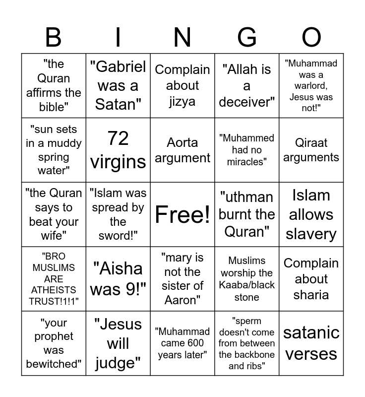 Muslim Bingo | christians debating | [Christianity] Muslim Debate Bingo | ME Ethnic & Religious Groups | islamic bingo