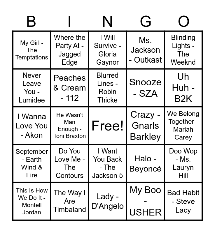 This bingo card has a free space and 97 words: Don't Let Go - En Vogue, Dancing In The Street - Martha & The Vandellas, Dilemma - Nelly, He Wasn't Man Enough - Toni Braxton, This Will Be (An Everlasting Love) - Natalie Cole, Water - Tyla, Fallin' - Alicia Keys, At Last - Etta James, What You Want - Mase, No Role Modelz - J. Cole, Location - Khalid, One In A Million - Aaliyah, No Diggity - Blackstreet, September - Earth Wind & Fire, Buy U a Drank - T-Pain, My Girl - The Temptations, Blinding Lights - The Weeknd, How Do I Breathe - Mario, Love Like This - Faith Evans, Stop! In The Name Of Love - The Supremes, Easy - Commodores, Finesse - Bruno Mars, Poison - Bell Biv DeVoe, Somebody's Watching Me - Rockwell, Rolling in the Deep - Adele, Blurred Lines - Robin Thicke, This Is How We Do It - Montell Jordan, Doo Wop - Ms. Lauryn Hill, Stay With Me - Sam Smith, Feels Good - Tony! Toni! Toné!, Peaches & Cream - 112, Ms. Jackson - Outkast, 1 2 Step - Ciara, Lalala - BBNO$, Lady - D'Angelo, I Want You Back - The Jackson 5, 1 Thing - Amerie, Yo - Chris Brown, Genie In a Bottle - Christina Aguilera, I Wanna Love You - Akon, Heard It Through The Grapevine - Marvin Gaye, We Belong Together - Mariah Carey, Upside Down - Diana Ross, My Boo - USHER, Do You Love Me - The Contours, Redbone - Childish Gambino, Love Don't Cost a Thing - Jennifer Lopez, All Night Long - Lionel Richie, Signed Sealed Delivered - Stevie Wonder, No Scrubs - TLC, ocean eyes - Billie Eilish, Oops (Oh My) - Tweet, Glamorous - Fergie, All For You - Janet Jackson, I've Got a Woman - Ray Charles, The Boy Is Mine - Brandy, Candy Rain - Soul For Real, Where the Party At - Jagged Edge, Unwritten - Natasha Bedingfield, Family Affair - Mary J. Blige, Trip - Ella Mai, Best of My Love - The Emotions, Super Freak - Rick James, Back To Black - Amy Winehouse, I'll Make Love To You - Boyz II Men, Work It - Missy Elliott, Killing Me Softly With His Song - Fugees, Move Ya Body - Nina Sky, Put Your Records On - Corinne Bailey Rae, The Way I Are Timbaland, Snooze - SZA, Always On Time - Ja Rule, Thinkin Bout You - Frank Ocean, So Sick - Ne-Yo, Blame It - Jamie Foxx, Love On The Brain - Rihanna, Love Machine - The Miracles, It's Not Right But It's Okay - Whitney Houston, Crazy - Gnarls Barkley, Don't Wanna Go Home - Jason Derulo, I Just Wanna Love U - JAY-Z, Uh Huh - B2K, Say My Name - Destiny's Child, Please Mr. Postman - The Marvelettes, I Do (Cherish You) - 98°, Frontin' - Pharrell Williams, Bad Habit - Steve Lacy, Trick Me Radio Mix - Kelis, MILLION DOLLAR BABY - Tommy Richman, Respect - Aretha Franklin, I Will Survive - Gloria Gaynor, I've Got the Music in Me - Kiki Dee, Billie Jean - Michael Jackson, Halo - Beyoncé, Never Leave You - Lumidee, Forever Your Girl - Paula Abdul and Just the Two of Us - Grover Washington.