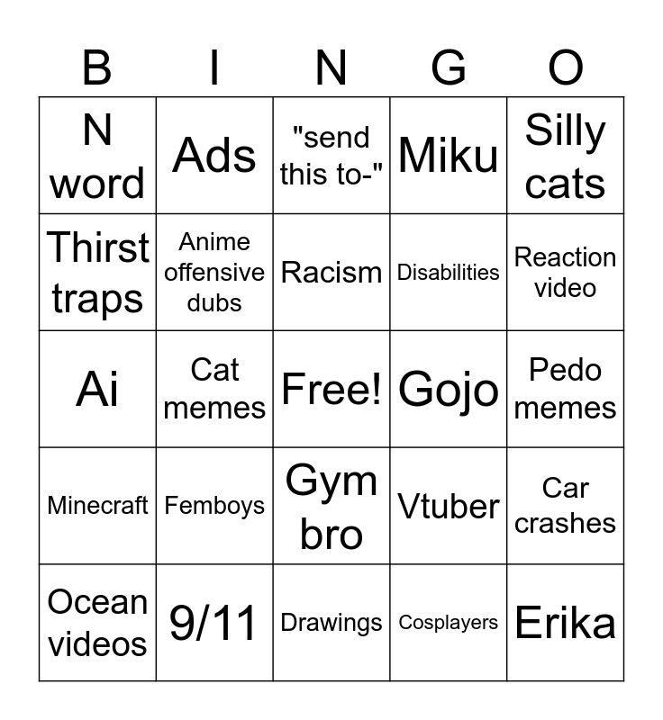 This bingo card has a free space and 24 words: Femboys, 9/11, Racism, Ocean videos, Silly cats, N word, Thirst traps, Ads, Gojo, Gym bro, Disabilities, Ai, Vtuber, Car crashes, Anime offensive dubs, Cosplayers, Pedo memes, "send this to-", Reaction video, Cat memes, Erika, Minecraft, Miku and Drawings.