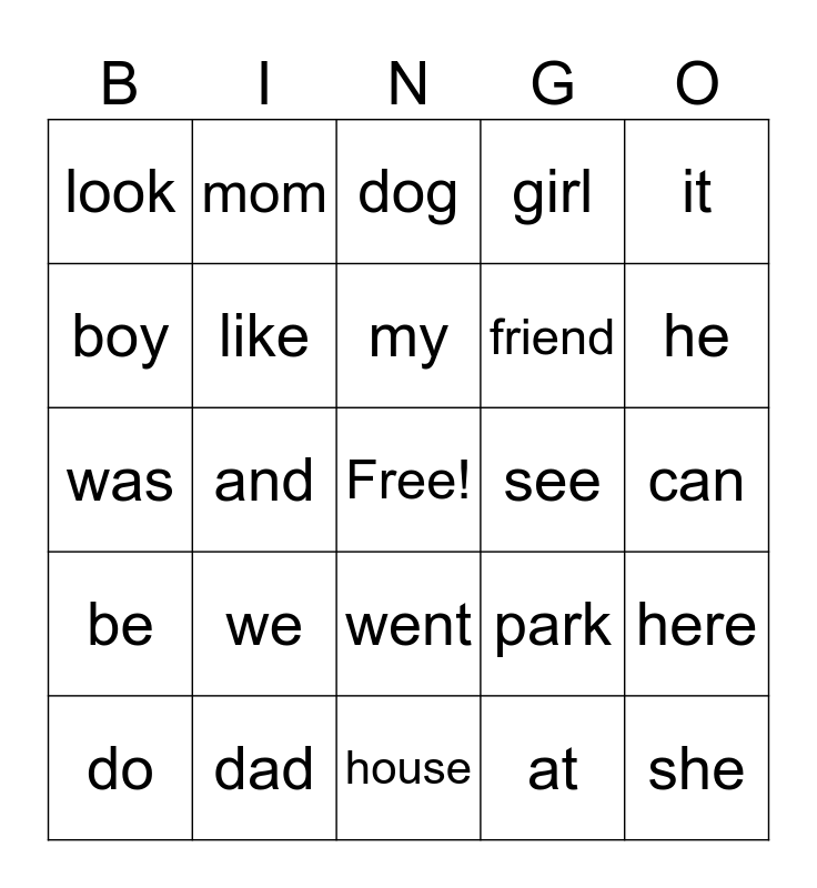 This bingo card has a free space and 24 words: we, dad, my, do, it, look, boy, mom, see, went, friend, was, park, here, like, at, can, dog, he, and, she, be, girl and house.