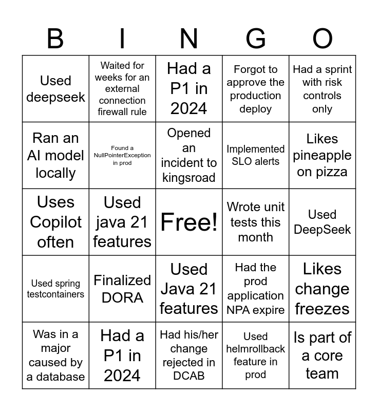 This bingo card has a free space and 30 words: Had a P1 in 2024, Found a Null pointer exception in prod, Used java 21 features, Wrote unit tests this month, Used deepseek, Had a P1 in 2024, Found a NullPointerException in prod, Used Java 21 features, Wrote unit tests this month, Had his/her change rejected in DCAB, Used DeepSeek, Is part of a core team, Used helmrollback feature in prod, Not in ICHP, uses VMs, Likes pineapple on pizza, Forgot they're on call and got called, Had the prod application NPA expire, Used spring testcontainers, Finalized DORA, Had a sprint with risk controls only, Uses Copilot often, Migrated to ing web 4, Waited for weeks for an external connection firewall rule, Implemented SLO alerts, Ran an AI model locally, Forgot to approve the production deploy, Likes change freezes, Was in a major caused by a database, Opened an incident to kingsroad and Is an ops guild presenter.