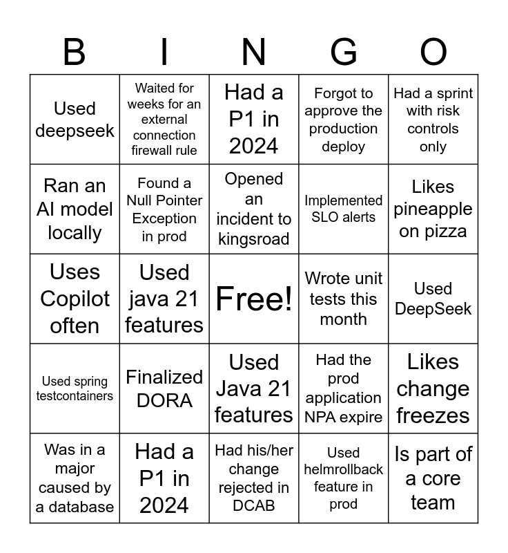 This bingo card has a free space and 30 words: Had a P1 in 2024, Found a Null pointer exception in prod, Used java 21 features, Wrote unit tests this month, Used deepseek, Had a P1 in 2024, Found a Null Pointer Exception in prod, Used Java 21 features, Wrote unit tests this month, Had his/her change rejected in DCAB, Used DeepSeek, Is part of a core team, Used helmrollback feature in prod, Not in ICHP, uses VMs, Likes pineapple on pizza, Forgot they're on call and got called, Had the prod application NPA expire, Used spring testcontainers, Finalized DORA, Had a sprint with risk controls only, Uses Copilot often, Migrated to ing web 4, Waited for weeks for an external connection firewall rule, Implemented SLO alerts, Ran an AI model locally, Forgot to approve the production deploy, Likes change freezes, Was in a major caused by a database, Opened an incident to kingsroad and Is an ops guild presenter.