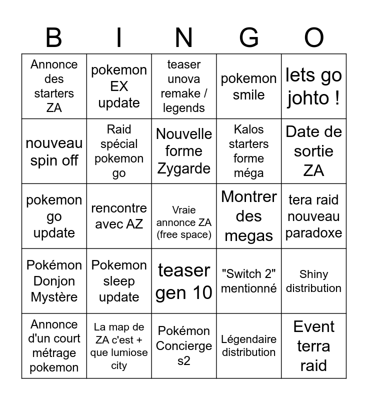 This bingo card has a free space and 24 words: Pokemon sleep update, La map de ZA c'est + que lumiose city, Nouvelle forme Zygarde, Annonce d'un court métrage pokemon, lets go johto !, Annonce des starters ZA, nouveau spin off, pokemon EX update, Montrer des megas, teaser gen 10, Kalos starters forme méga, pokemon go update, "Switch 2" mentionné, Shiny distribution, Raid spécial pokemon go, Légendaire distribution, tera raid nouveau paradoxe, teaser unova remake / legends, Date de sortie ZA, rencontre avec AZ, Event terra raid, Pokémon Donjon Mystère, pokemon smile and Pokémon Concierge s2.