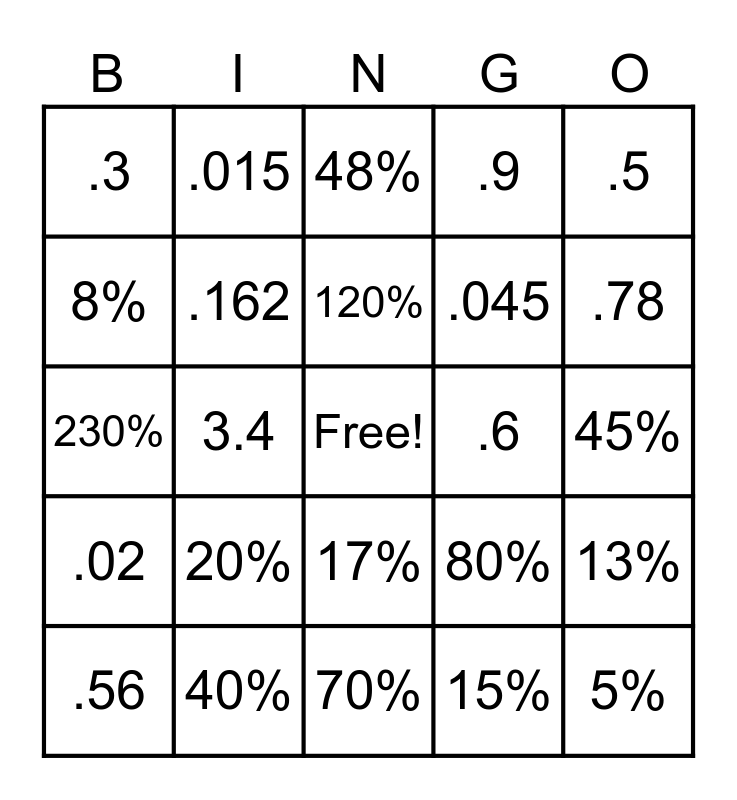 This bingo card has a free space and 24 words: 20%, 40%, 120%, .56, .5, .3, 8%, .015, .6, 17%, .045, 230%, 80%, 13%, .162, 15%, 45%, 48%, .78, 3.4, 5%, .02, .9 and 70%.