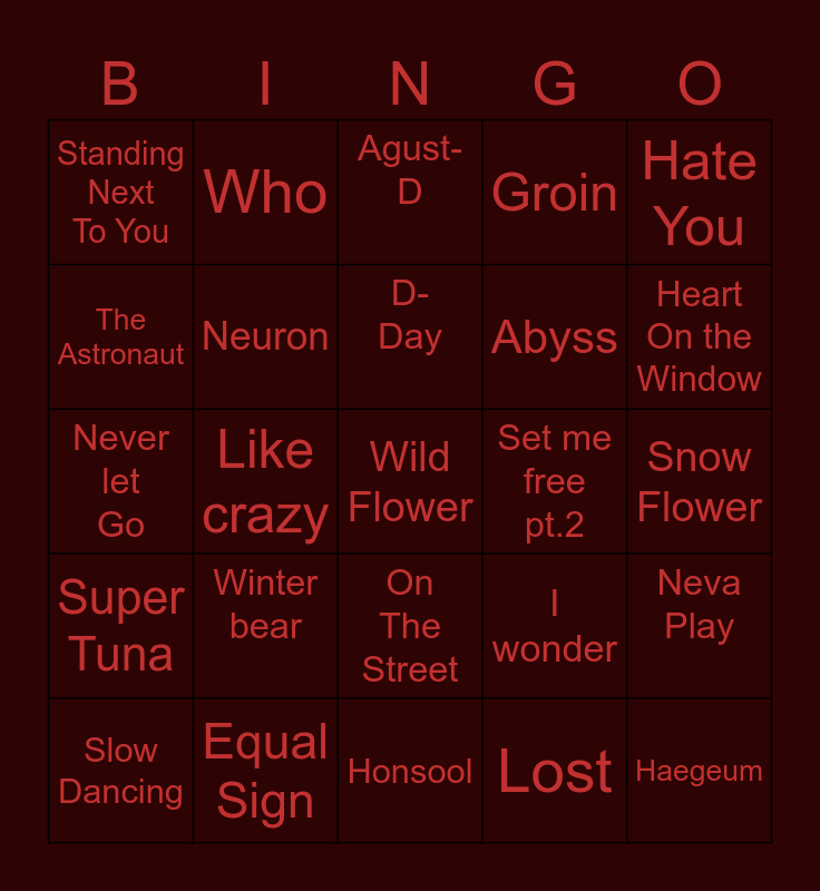 This bingo card has a free space and 24 words: Winter bear, Equal Sign, D-Day, Slow Dancing, Hate You, Standing Next To You, The Astronaut, Who, Set me free pt.2, On The Street, Abyss, Never let Go, I wonder, Neva Play, Neuron, Lost, Snow Flower, Agust-D, Heart On the Window, Like crazy, Haegeum, Super Tuna, Groin and Honsool.