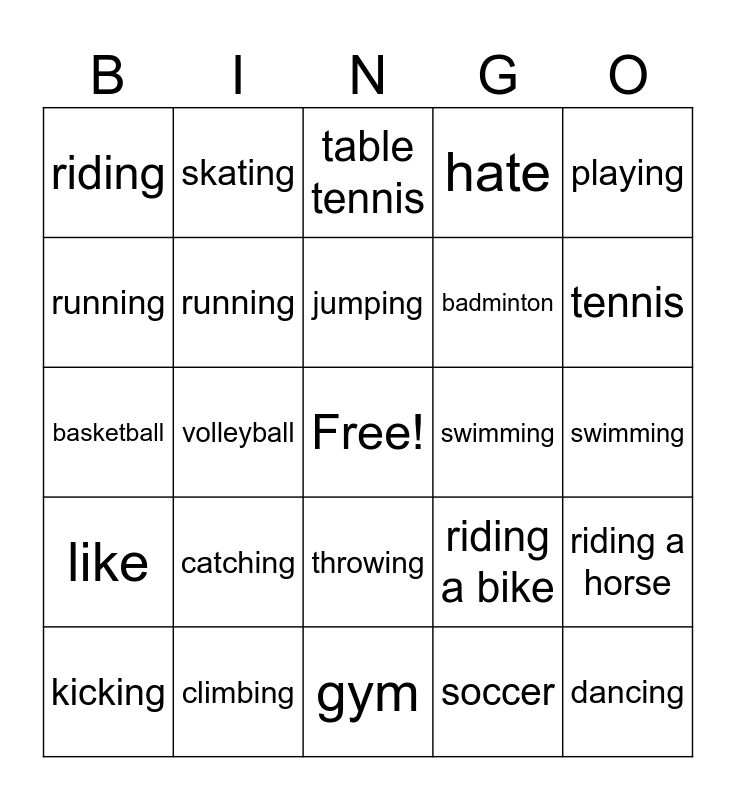 This bingo card has a free space and 24 words: catching, climbing, jumping, kicking, playing, riding, running, skating, swimming, throwing, badminton, basketball, riding a bike, riding a horse, running, soccer, swimming, table tennis, tennis, volleyball, dancing, like, hate and gym.