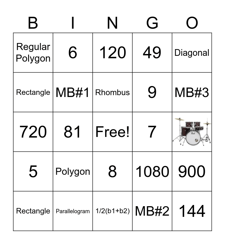 This bingo card has 1 images, a free space and 23 words: Polygon, Parallelogram, Rhombus, Rectangle, Diagonal, Regular Polygon, Rectangle, 6, 7, 8, 9, 720, 1080, 900, MB#1, MB#2, 120, MB#3, 81, 144, 5, 49 and 1/2(b1+b2).