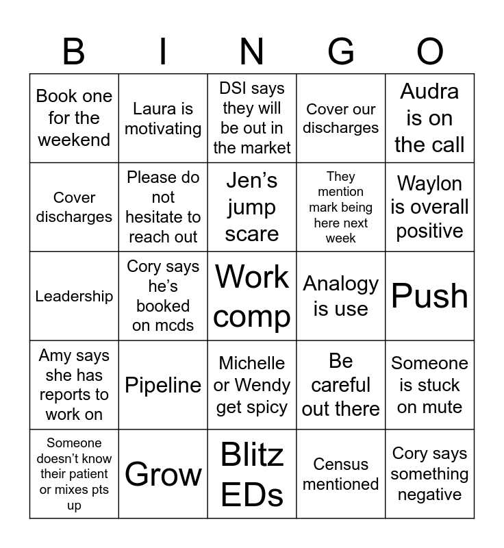 This bingo card has a free space and 24 words: Pipeline, Grow, Jen’s jump scare, Someone doesn’t know their patient or mixes pts up, Audra is on the call, Book one for the weekend, Cover discharges, Laura is motivating, Analogy is use, Michelle or Wendy get spicy, They mention mark being here next week, Leadership, Be careful out there, Someone is stuck on mute, Please do not hesitate to reach out, Census mentioned, Push, DSI says they will be out in the market, Waylon is overall positive, Cory says he’s booked on mcds, Cory says something negative, Amy says she has reports to work on, Cover our discharges and Blitz EDs.