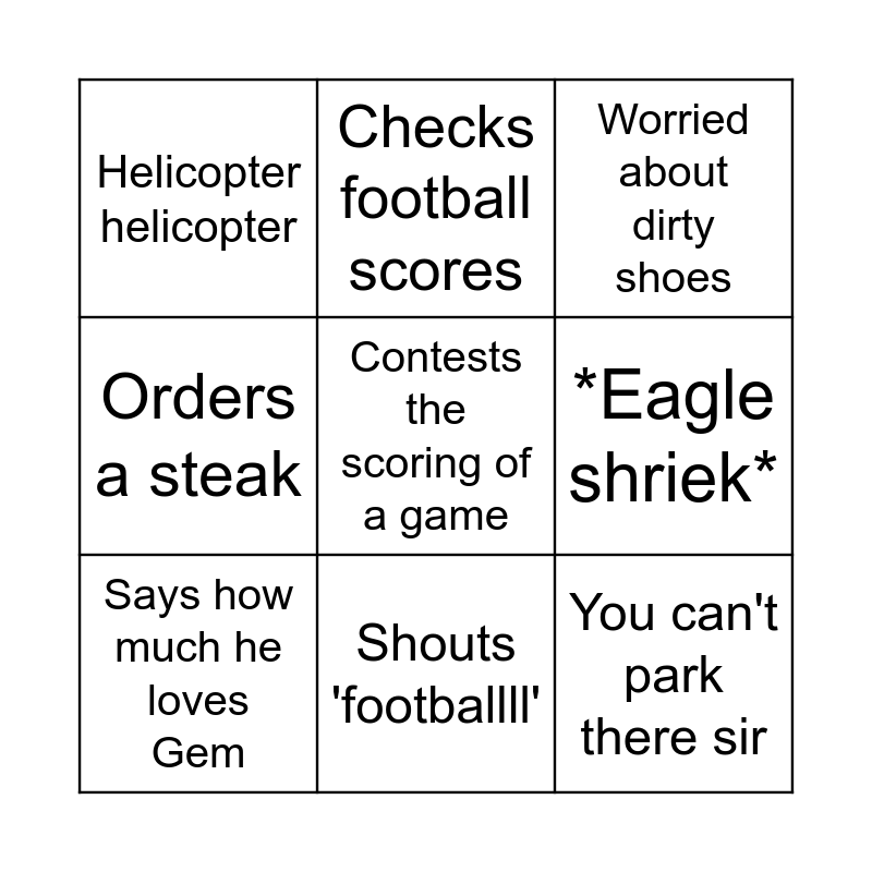 This bingo card has 21 words: URRRZ, And anotherrrrrr, Checks football scores, Don't panic!, Adjusts hair, Says how much he loves Gem, Helicopter helicopter, Worried about dirty shoes, Tells everyone it's full time for the Reading match, Shouts 'footballll', You can't park there sir, Orders a steak, Chugs a beer, Rejects a beer, *Eagle shriek*, Passionate celebration of winning, Tells someone how to play the game, Mentions Pokemon, Contests the scoring of a game, Talks about his house project and Asks to go to bed.