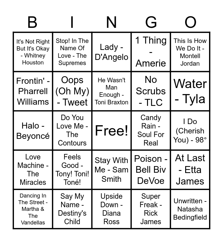 This bingo card has a free space and 97 words: Heard It Through The Grapevine - Marvin Gaye, Killing Me Softly With His Song - Fugees, September - Earth Wind & Fire, Do You Love Me - The Contours, My Boo - USHER, I've Got the Music in Me - Kiki Dee, Uh Huh - B2K, Billie Jean - Michael Jackson, Thinkin Bout You - Frank Ocean, No Diggity - Blackstreet, Yo - Chris Brown, Dilemma - Nelly, The Way I Are Timbaland, Love Machine - The Miracles, I Will Survive - Gloria Gaynor, It's Not Right But It's Okay - Whitney Houston, This Is How We Do It - Montell Jordan, Respect - Aretha Franklin, We Belong Together - Mariah Carey, I Wanna Love You - Akon, What You Want - Mase, Rolling in the Deep - Adele, Genie In a Bottle - Christina Aguilera, This Will Be (An Everlasting Love) - Natalie Cole, Please Mr. Postman - The Marvelettes, He Wasn't Man Enough - Toni Braxton, Dancing In The Street - Martha & The Vandellas, At Last - Etta James, Redbone - Childish Gambino, I've Got a Woman - Ray Charles, Oops (Oh My) - Tweet, 1 Thing - Amerie, Love Like This - Faith Evans, How Do I Breathe - Mario, Upside Down - Diana Ross, Stay With Me - Sam Smith, Crazy - Gnarls Barkley, 1 2 Step - Ciara, Ms. Jackson - Outkast, Halo - Beyoncé, Don't Let Go - En Vogue, I Do (Cherish You) - 98°, Easy - Commodores, Super Freak - Rick James, Feels Good - Tony! Toni! Toné!, All For You - Janet Jackson, Trick Me Radio Mix - Kelis, I Want You Back - The Jackson 5, Don't Wanna Go Home - Jason Derulo, Finesse - Bruno Mars, I Just Wanna Love U - JAY-Z, Family Affair - Mary J. Blige, Put Your Records On - Corinne Bailey Rae, My Girl - The Temptations, MILLION DOLLAR BABY - Tommy Richman, One In A Million - Aaliyah, The Boy Is Mine - Brandy, Stop! In The Name Of Love - The Supremes, Peaches & Cream - 112, Where the Party At - Jagged Edge, Somebody's Watching Me - Rockwell, Doo Wop - Ms. Lauryn Hill, Love On The Brain - Rihanna, No Role Modelz - J. Cole, Location - Khalid, Blame It - Jamie Foxx, Bad Habit - Steve Lacy, ocean eyes - Billie Eilish, I'll Make Love To You - Boyz II Men, Say My Name - Destiny's Child, No Scrubs - TLC, Blinding Lights - The Weeknd, All Night Long - Lionel Richie, Never Leave You - Lumidee, Lalala - BBNO$, Back To Black - Amy Winehouse, Just the Two of Us - Grover Washington, Trip - Ella Mai, Candy Rain - Soul For Real, Blurred Lines - Robin Thicke, Work It - Missy Elliott, Water - Tyla, Glamorous - Fergie, Snooze - SZA, Buy U a Drank - T-Pain, So Sick - Ne-Yo, Unwritten - Natasha Bedingfield, Signed Sealed Delivered - Stevie Wonder, Move Ya Body - Nina Sky, Forever Your Girl - Paula Abdul, Lady - D'Angelo, Always On Time - Ja Rule, Fallin' - Alicia Keys, Poison - Bell Biv DeVoe, Frontin' - Pharrell Williams, Best of My Love - The Emotions and Love Don't Cost a Thing - Jennifer Lopez.
