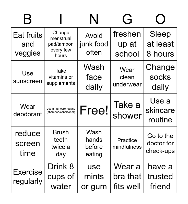 This bingo card has a free space and 24 words: Brush teeth twice a day, Drink 8 cups of water, Wash face daily, Exercise regularly, Sleep at least 8 hours, Eat fruits and veggies, Use sunscreen, Change menstrual pad/tampon every few hours, Take a shower, Wash hands before eating, Wear clean underwear, Wear deodorant, Practice mindfulness, Go to the doctor for check-ups, Take vitamins or supplements, Wear a bra that fits well, Use a skincare routine, Avoid junk food often, Change socks daily, Use a hair care routine (shampoo/conditioner), have a trusted friend, reduce screen time, freshen up at school and use mints or gum.