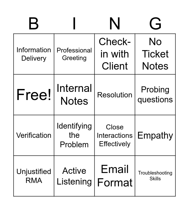 This bingo card has 16 words: Active Listening, Empathy, Check-in with Client, Information Delivery, Verification, Professional Greeting, Close Interactions Effectively, Email Format, Free!, Internal Notes, Unjustified RMA, No Ticket Notes, Identifying the Problem, Probing questions, Resolution and Troubleshooting Skills.