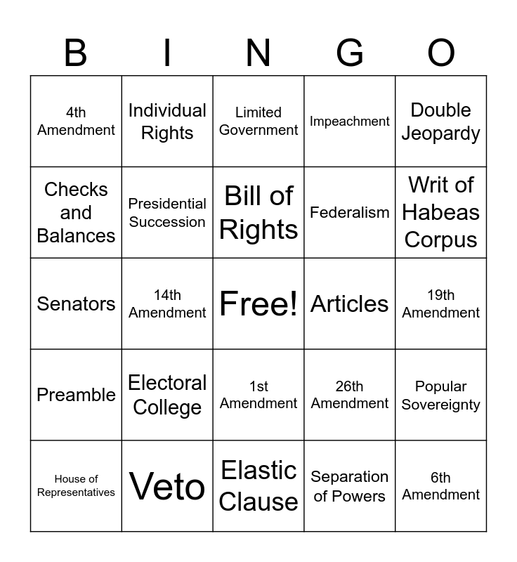 This bingo card has a free space and 28 words: Popular Sovereignty, Republicanism, Federalism, Separation of Powers, Checks and Balances, Limited Government, Individual Rights, Preamble, Articles, House of Representatives, Senators, Impeachment, Veto, Elastic Clause, Writ of Habeas Corpus, President, Electoral College, Presidential Succession, Bill of Rights, 1st Amendment, 4th Amendment, 5th Amendment, 6th Amendment, 14th Amendment, 19th Amendment, 26th Amendment, Double Jeopardy and Ratify.
