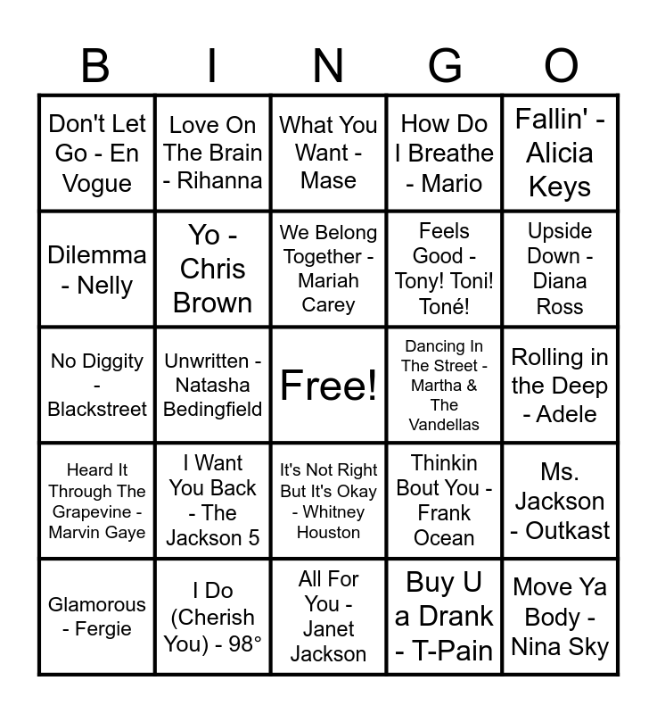 This bingo card has a free space and 97 words: I Just Wanna Love U - JAY-Z, I Will Survive - Gloria Gaynor, Work It - Missy Elliott, Unwritten - Natasha Bedingfield, The Boy Is Mine - Brandy, At Last - Etta James, Please Mr. Postman - The Marvelettes, He Wasn't Man Enough - Toni Braxton, Water - Tyla, Poison - Bell Biv DeVoe, Doo Wop - Ms. Lauryn Hill, Frontin' - Pharrell Williams, Lalala - BBNO$, Heard It Through The Grapevine - Marvin Gaye, All Night Long - Lionel Richie, Don't Let Go - En Vogue, Fallin' - Alicia Keys, Love Don't Cost a Thing - Jennifer Lopez, Never Leave You - Lumidee, Killing Me Softly With His Song - Fugees, Love Like This - Faith Evans, Somebody's Watching Me - Rockwell, Oops (Oh My) - Tweet, One In A Million - Aaliyah, September - Earth Wind & Fire, We Belong Together - Mariah Carey, Glamorous - Fergie, Ms. Jackson - Outkast, I've Got a Woman - Ray Charles, Billie Jean - Michael Jackson, Yo - Chris Brown, How Do I Breathe - Mario, Stop! In The Name Of Love - The Supremes, Bad Habit - Steve Lacy, All For You - Janet Jackson, It's Not Right But It's Okay - Whitney Houston, Trick Me Radio Mix - Kelis, Just the Two of Us - Grover Washington, I'll Make Love To You - Boyz II Men, No Diggity - Blackstreet, I Wanna Love You - Akon, Rolling in the Deep - Adele, Back To Black - Amy Winehouse, Buy U a Drank - T-Pain, I Want You Back - The Jackson 5, No Scrubs - TLC, Finesse - Bruno Mars, Easy - Commodores, My Girl - The Temptations, ocean eyes - Billie Eilish, Respect - Aretha Franklin, This Is How We Do It - Montell Jordan, Location - Khalid, Best of My Love - The Emotions, So Sick - Ne-Yo, Forever Your Girl - Paula Abdul, Family Affair - Mary J. Blige, Love On The Brain - Rihanna, Crazy - Gnarls Barkley, Blame It - Jamie Foxx, Trip - Ella Mai, MILLION DOLLAR BABY - Tommy Richman, Don't Wanna Go Home - Jason Derulo, Candy Rain - Soul For Real, Uh Huh - B2K, This Will Be (An Everlasting Love) - Natalie Cole, 1 2 Step - Ciara, Blinding Lights - The Weeknd, Do You Love Me - The Contours, I Do (Cherish You) - 98°, Feels Good - Tony! Toni! Toné!, Genie In a Bottle - Christina Aguilera, No Role Modelz - J. Cole, The Way I Are Timbaland, Where the Party At - Jagged Edge, Snooze - SZA, Say My Name - Destiny's Child, Blurred Lines - Robin Thicke, Dancing In The Street - Martha & The Vandellas, Lady - D'Angelo, Peaches & Cream - 112, Upside Down - Diana Ross, Put Your Records On - Corinne Bailey Rae, Redbone - Childish Gambino, My Boo - USHER, 1 Thing - Amerie, Move Ya Body - Nina Sky, Always On Time - Ja Rule, Halo - Beyoncé, Love Machine - The Miracles, What You Want - Mase, Stay With Me - Sam Smith, Signed Sealed Delivered - Stevie Wonder, Thinkin Bout You - Frank Ocean, Dilemma - Nelly, Super Freak - Rick James and I've Got the Music in Me - Kiki Dee.