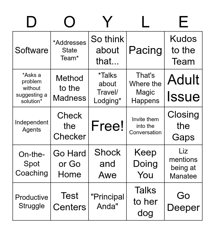This bingo card has a free space and 33 words: PUMA, Granular, Check the Checker, Trash or Treasure, On-the-Spot Coaching, Method to the Madness, Kudos to the Team, Productive Struggle, *Addresses State Team*, Rigor, *Talks about Travel/ Lodging*, So think about that..., Crunch Time Plans, I love that, Invite them into the Conversation, Adult Issue, Test Centers, Independent Agents, Go Hard or Go Home, Keep Doing You, Shock and Awe, *Talks about other schools*, Software, Closing the Gaps, "Principal Anda", Go Deeper, Pacing, That's Where the Magic Happens, *Asks a problem without suggesting a solution*, Liz mentions being at Manatee, Fidelity, Talks to her dog and Mispronounces Someone's Name.