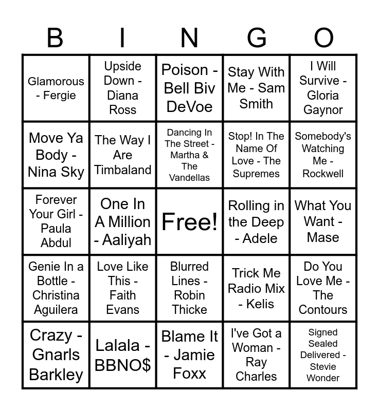 This bingo card has a free space and 97 words: Heard It Through The Grapevine - Marvin Gaye, Frontin' - Pharrell Williams, Back To Black - Amy Winehouse, One In A Million - Aaliyah, Trip - Ella Mai, Oops (Oh My) - Tweet, Family Affair - Mary J. Blige, I Wanna Love You - Akon, MILLION DOLLAR BABY - Tommy Richman, Dilemma - Nelly, 1 Thing - Amerie, I've Got the Music in Me - Kiki Dee, Billie Jean - Michael Jackson, Genie In a Bottle - Christina Aguilera, Love Don't Cost a Thing - Jennifer Lopez, Glamorous - Fergie, I Will Survive - Gloria Gaynor, Work It - Missy Elliott, No Diggity - Blackstreet, Thinkin Bout You - Frank Ocean, Fallin' - Alicia Keys, Candy Rain - Soul For Real, Best of My Love - The Emotions, This Is How We Do It - Montell Jordan, Always On Time - Ja Rule, Dancing In The Street - Martha & The Vandellas, Crazy - Gnarls Barkley, Do You Love Me - The Contours, I'll Make Love To You - Boyz II Men, I Do (Cherish You) - 98°, The Way I Are Timbaland, Stay With Me - Sam Smith, So Sick - Ne-Yo, ocean eyes - Billie Eilish, Blame It - Jamie Foxx, Blurred Lines - Robin Thicke, Lady - D'Angelo, Love Machine - The Miracles, Where the Party At - Jagged Edge, Forever Your Girl - Paula Abdul, The Boy Is Mine - Brandy, What You Want - Mase, Uh Huh - B2K, I've Got a Woman - Ray Charles, Love Like This - Faith Evans, Easy - Commodores, I Just Wanna Love U - JAY-Z, Peaches & Cream - 112, Snooze - SZA, Super Freak - Rick James, Love On The Brain - Rihanna, Killing Me Softly With His Song - Fugees, All For You - Janet Jackson, Don't Wanna Go Home - Jason Derulo, Just the Two of Us - Grover Washington, Ms. Jackson - Outkast, Buy U a Drank - T-Pain, Upside Down - Diana Ross, Blinding Lights - The Weeknd, This Will Be (An Everlasting Love) - Natalie Cole, Put Your Records On - Corinne Bailey Rae, Yo - Chris Brown, Never Leave You - Lumidee, 1 2 Step - Ciara, No Scrubs - TLC, Doo Wop - Ms. Lauryn Hill, Finesse - Bruno Mars, Location - Khalid, Water - Tyla, Lalala - BBNO$, Stop! In The Name Of Love - The Supremes, My Boo - USHER, Unwritten - Natasha Bedingfield, I Want You Back - The Jackson 5, Halo - Beyoncé, Say My Name - Destiny's Child, He Wasn't Man Enough - Toni Braxton, My Girl - The Temptations, Rolling in the Deep - Adele, Don't Let Go - En Vogue, Bad Habit - Steve Lacy, Somebody's Watching Me - Rockwell, It's Not Right But It's Okay - Whitney Houston, At Last - Etta James, Feels Good - Tony! Toni! Toné!, All Night Long - Lionel Richie, Signed Sealed Delivered - Stevie Wonder, We Belong Together - Mariah Carey, Redbone - Childish Gambino, No Role Modelz - J. Cole, Poison - Bell Biv DeVoe, How Do I Breathe - Mario, Please Mr. Postman - The Marvelettes, Trick Me Radio Mix - Kelis, Move Ya Body - Nina Sky, Respect - Aretha Franklin and September - Earth Wind & Fire.