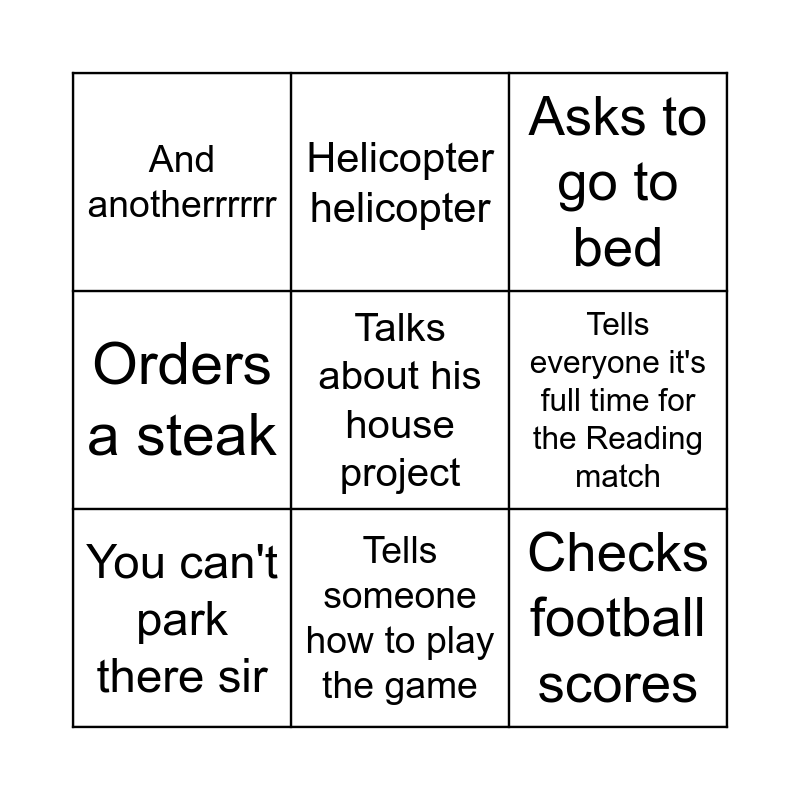 ⚠ This card has duplicate items: URRRZ (2), And anotherrrrrr (2), Checks football scores (2), Don't panic! (2), Adjusts hair (2), Says how much he loves Gem (2), Helicopter helicopter (2), Worried about dirty shoes (2), Tells everyone it's full time for the Reading match (2), Shouts 'footballll' (2), You can't park there sir (2), Orders a steak (2), Chugs a beer (2), *Eagle shriek* (2), Passionate celebration of winning (2), Tells someone how to play the game (2), Mentions Pokemon (2), Contests the scoring of a game (2), Talks about his house project (2), Asks to go to bed (2)