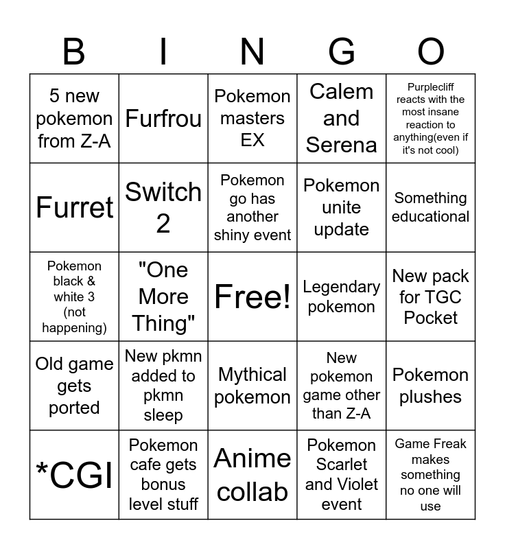 This bingo card has a free space and 24 words: New pkmn added to pkmn sleep, Pokemon cafe gets bonus level stuff, Pokemon go has another shiny event, *CGI, Purplecliff reacts with the most insane reaction to anything(even if it's not cool), 5 new pokemon from Z-A, Furret, Furfrou, Legendary pokemon, Mythical pokemon, Pokemon unite update, Pokemon black & white 3 (not happening), New pokemon game other than Z-A, Pokemon plushes, Switch 2, Pokemon Scarlet and Violet event, New pack for TGC Pocket, Pokemon masters EX, Something educational, "One More Thing", Game Freak makes something no one will use, Old game gets ported, Calem and Serena and Anime collab.
