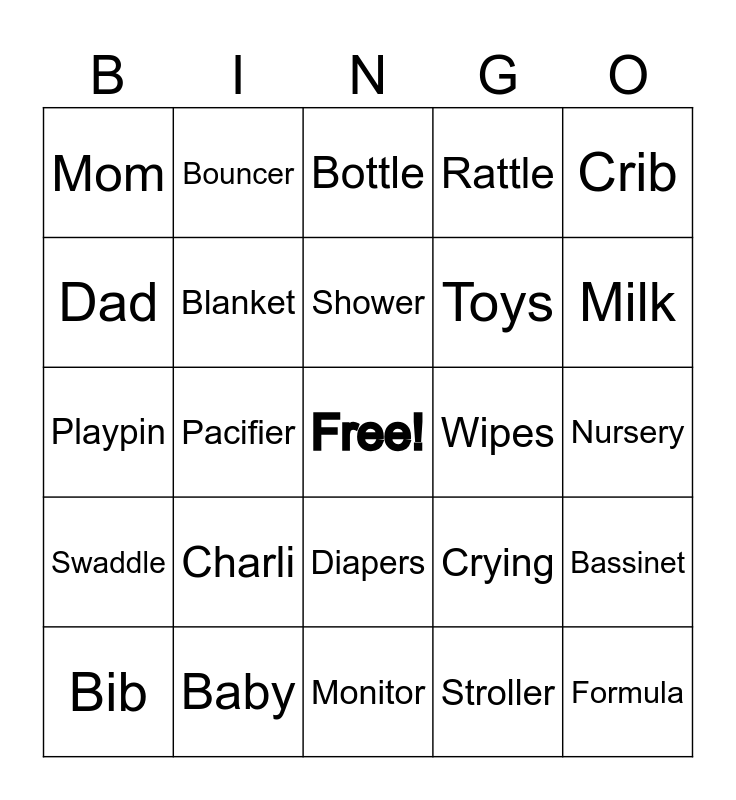 This bingo card has a free space and 24 words: Charli, Baby, Shower, Bib, Crib, Mom, Dad, Bouncer, Wipes, Diapers, Toys, Playpin, Crying, Bassinet, Blanket, Stroller, Nursery, Bottle, Milk, Pacifier, Formula, Swaddle, Rattle and Monitor.