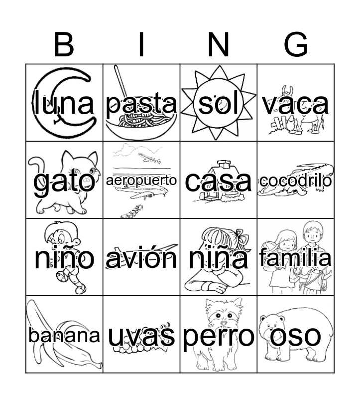 This bingo card has 19 images, a free space and 19 words: oso, gafas, sol, bebe, familia, gato, perro, luna, pasta, niño, avión, aeropuerto, casa, uvas, banana, coche, vaca, cocodrilo and sombrero.