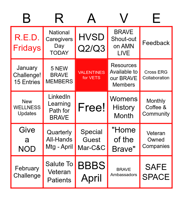 This bingo card has a free space and 24 words: Quarterly All-Hands Mtg - April, Salute To Veteran Patients, VALENTINES for VETS, February Challenge, Feedback, R.E.D. Fridays, January Challenge! 15 Entries, National Caregivers Day TODAY, Womens History Month, Special Guest Mar-C&C, Resources Available to our BRAVE Members, New WELLNESS Updates, "Home of the Brave", Veteran Owned Companies, 5 NEW BRAVE MEMBERS, BRAVE Ambassadors, Monthly Coffee & Community, HVSD Q2/Q3, Cross ERG Collaboration, LinkedIn Learning Path for BRAVE, SAFE SPACE, Give a NOD, BRAVE Shout-out on AMN LIVE and BBBS April.