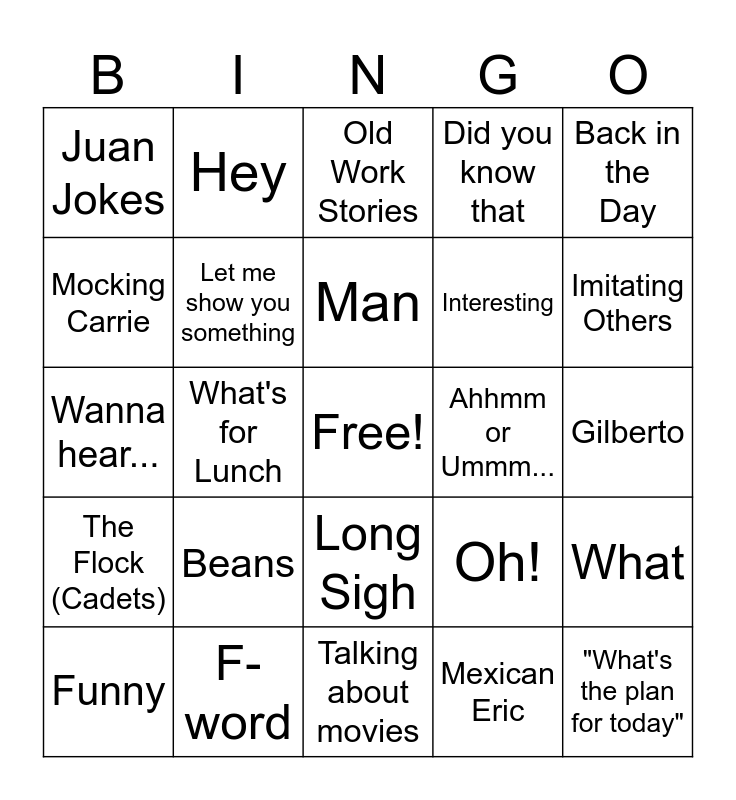 This bingo card has a free space and 24 words: Beans, F-word, Man, Funny, Back in the Day, Juan Jokes, Mocking Carrie, Hey, Ahhmm or Ummm..., Long Sigh, Interesting, Wanna hear..., Oh!, What, Let me show you something, Mexican Eric, Gilberto, Old Work Stories, Imitating Others, What's for Lunch, "What's the plan for today", The Flock (Cadets), Did you know that and Talking about movies.