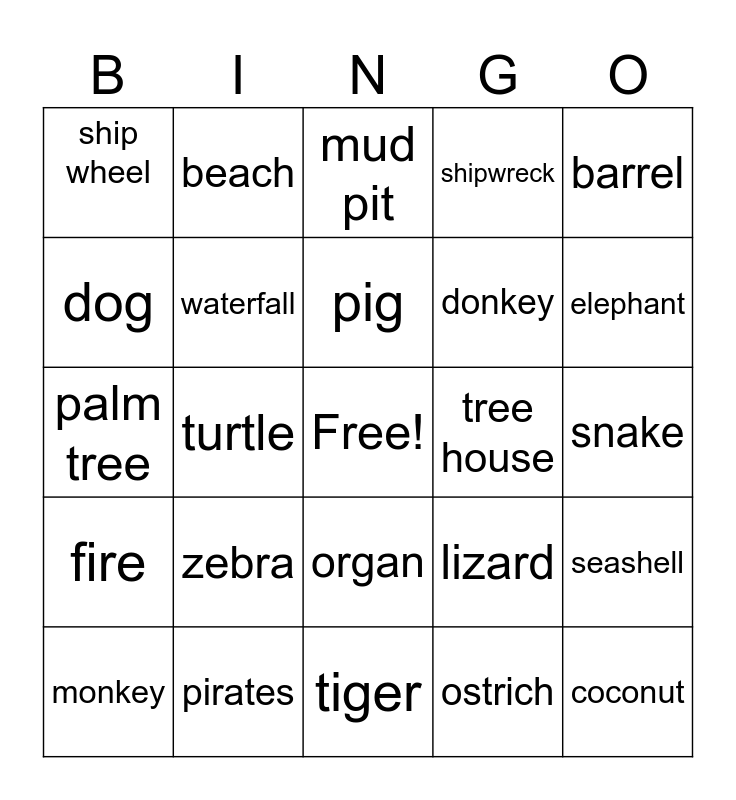 This bingo card has a free space and 29 words: monkey, banana, turtle, shark, ship wheel, mud pit, waterfall, zebra, tree house, pirates, snake, coconut, tiger, ostrich, elephant, Christmas tree, organ, fire, barrel, palm tree, lizard, prayer, donkey, dog, shipwreck, beach, seashell, pig and ducks.