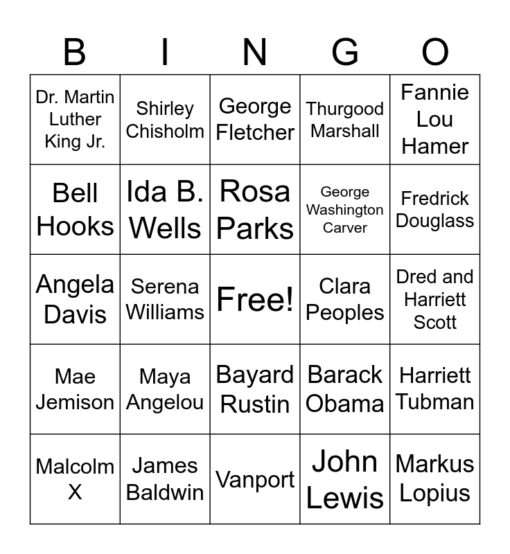 This bingo card has a free space and 24 words: Maya Angelou, James Baldwin, Rosa Parks, Malcolm X, Fannie Lou Hamer, Dr. Martin Luther King Jr., Bell Hooks, Shirley Chisholm, Clara Peoples, Bayard Rustin, George Washington Carver, Angela Davis, Barack Obama, Harriett Tubman, Ida B. Wells, John Lewis, Dred and Harriett Scott, George Fletcher, Fredrick Douglass, Serena Williams, Markus Lopius, Mae Jemison, Thurgood Marshall and Vanport.