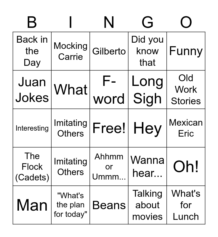 This bingo card has a free space and 25 words: Imitating Others, Beans, F-word, Man, Funny, Back in the Day, Juan Jokes, Mocking Carrie, Hey, Ahhmm or Ummm..., Long Sigh, Interesting, Wanna hear..., Oh!, What, Let me show you something, Mexican Eric, Gilberto, Old Work Stories, Imitating Others, What's for Lunch, "What's the plan for today", The Flock (Cadets), Did you know that and Talking about movies.