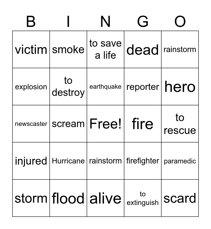 This bingo card has a free space and 24 words: Hurricane, flood, earthquake, storm, rainstorm, victim, explosion, smoke, fire, rainstorm, reporter, newscaster, firefighter, paramedic, to destroy, to extinguish, to rescue, to save a life, hero, scream, scard, injured, dead and alive.