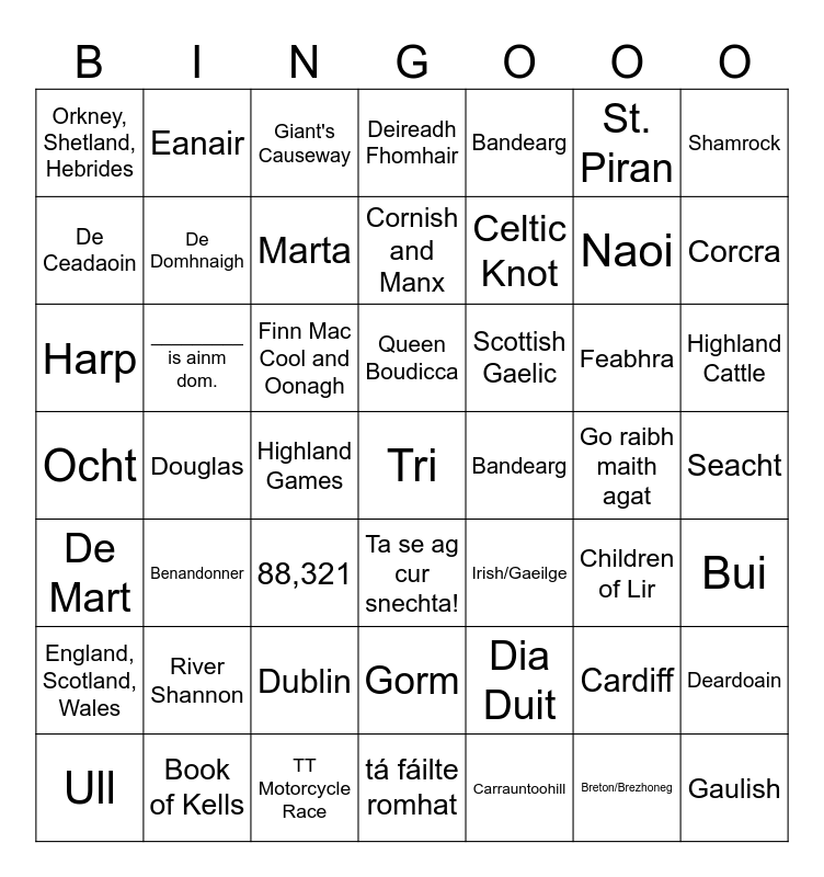 This bingo card has 134 words: Free!, Ta se ag cur snechta!, Dia Duit, Maiden mhaith, Tráthnóna mhaith, Conas ata tu?, _________ is ainm dom., Le do thoil, Go raibh maith agat, tá fáilte romhat, Slan, Snechta, Ull, Nialas, Aon, Do, Tri, Caethair, Cuig, Se, Seacht, Ocht, Naoi, Deich, De Luain, De Mart, De Ceadaoin, Deardoain, De Haoine, De Sathairn, De Domhnaigh, Eanair, Feabhra, Marta, Aibrean, Bealtane, Meitheamh, Iuil, Iunasa, Meam Fromhair, Deireadh Fhomhair, Samhna, Nollag, Dear, Oraiste, Bui, Glas, Gorm, Corcra, Bandearg, Donn, Bandearg, Liath, Dubh, 356,000, Breton/Brezhoneg, Carnac Alighnments, France, St. Anne, Celtic Knot, Cornish and Manx, Gaulish, Hilfort, Iron Age, Roundhouse, 2,000, Bosigran Castle, Cornish/Kernewek, England, St. Piran, London, Queen Boudicca, River Thames, Stonehenge, 1,887,437, Aran Islands, Book of Kells, Carrauntoohill, Children of Lir, Cliffs of Moher, Dublin, Emerald Isle, Euro, Harp, Irish/Gaeilge, Potato Famine, Rattlin' Bog, Ring of Kerry, River Shannon, Riverdance, Shamrock, St. Patrick, Tír na nÓg, the Land of Youth, 1,823, Douglas, Manx/Gaelg, St. Maughold, Triskelion, TT Motorcycle Race, Tynwald - 979 A.D., Belfast, Finn Mac Cool and Oonagh, Giant's Causeway, Loch Neagh, 88,321, Bagpipes, Battle of Culloden, Beltane Fire Festival, Ben Nevis, Benandonner, Edinbrough, Haggis, Highland Cattle, Highland Fling, Highland Games, Kilt, Loch Lomond, Loch Ness, Orkney, Shetland, Hebrides, Robert Burns, Scottish Gaelic, St. Andrew, Tartan, England, Scotland, Wales, England, Scotland, Wales, Northern Ireland, Oxford, Cambridge, Trinity, St. Andrews, Glasgow, Aberdeen, Edinburgh, Pound, Severn River, 947,000, Cardiff, Dragon, Mt. Snowdonia, St. David and Welsh/Cymraeg.
