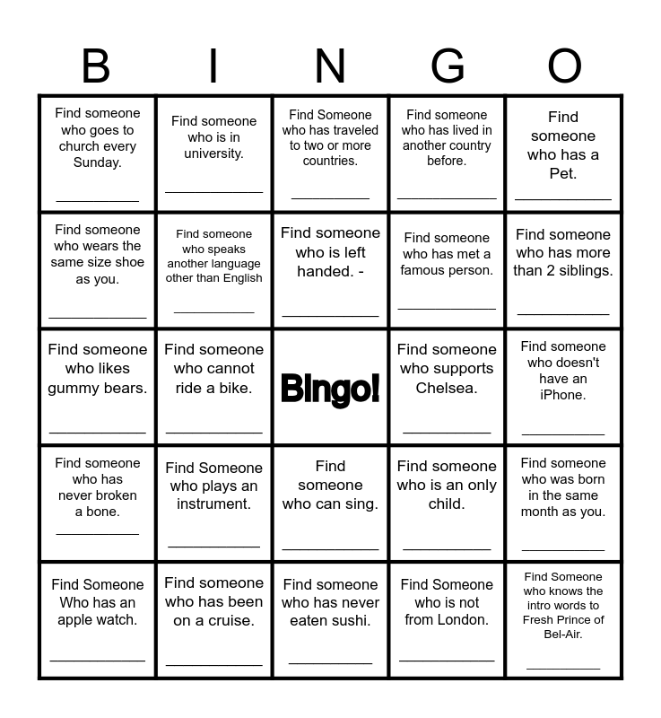 This bingo card has a free space and 24 words: Find Someone Who has an apple watch. ____________, Find Someone who plays an instrument. ___________, Find someone who is left handed. - ___________, Find Someone who is not from London. ____________, Find someone who has a Pet. ___________, Find someone who goes to church every Sunday. ___________, Find someone who is in university. _____________, Find Someone who has traveled to two or more countries. ___________, Find someone who supports Chelsea. __________, Find someone who doesn't have an iPhone. ___________, Find someone who likes gummy bears. ___________, Find someone who speaks another language other than English ____________, Find someone who is an only child. __________, Find someone who was born in the same month as you. ___________, Find someone who wears the same size shoe as you. _____________, Find someone who has been on a cruise. ___________, Find someone who has never eaten sushi. __________, Find someone who has lived in another country before. ______________, Find someone who has more than 2 siblings. ___________, Find someone who has never broken a bone. ___________, Find someone who cannot ride a bike. ___________, Find someone who can sing. ___________, Find someone who has met a famous person. _____________ and Find Someone who knows the intro words to Fresh Prince of Bel-Air. ___________.