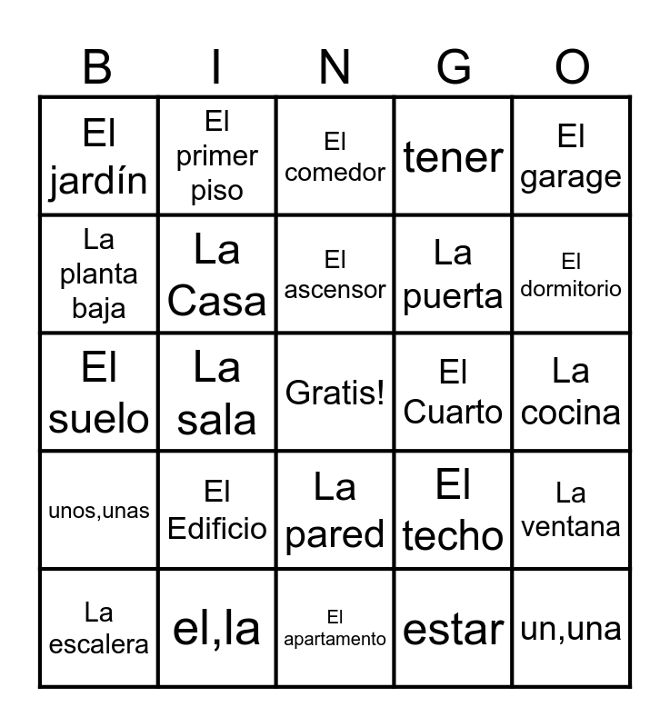 This bingo card has a free space and 25 words: El Edificio, El apartamento, El ascensor, La escalera, El garage, El jardín, La planta baja, El primer piso, El Cuarto, La pared, La puerta, El suelo, El techo, La ventana, La Casa, El baño, La cocina, El comedor, El dormitorio, La sala, un,una, el,la, unos,unas, tener and estar.