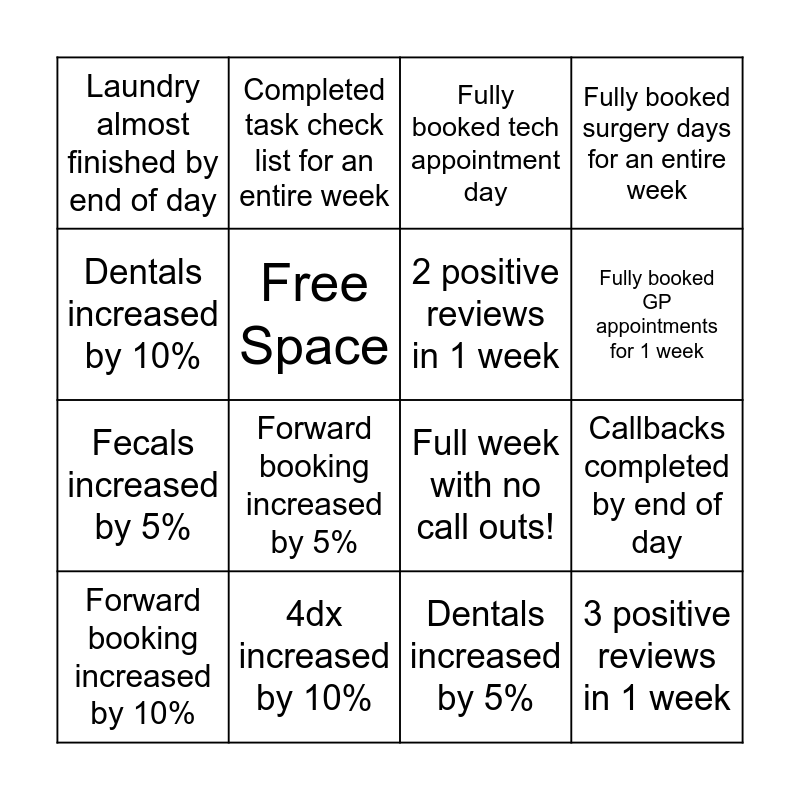 This bingo card has 25 words: 4dx increased by 5%, End of Day over $13,000, Full week with no call outs!, Full urgent care day, Laundry almost finished by end of day, Completed task check list for an entire week, Fully booked tech appointment day, Fully booked surgery days for an entire week, Fecals increased by 5%, Forward booking increased by 5%, Dentals increased by 5%, Callbacks completed by end of day, Exceptional teamwork day, 4dx increased by 10%, 2 positive reviews in 1 week, Fecals increased by 10%, Forward booking increased by 10%, Free Space, Used new puppy/kitten board and posted photo, 3 positive reviews in 1 week, Dentals increased by 10%, New clients increased by 5% in 1 week, End of day over $14,000, Fully booked GP appointments for 1 week and Free Space.