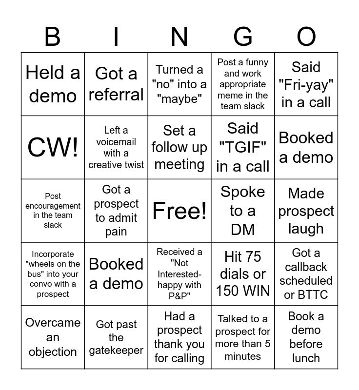 This bingo card has a free space and 24 words: Booked a demo, Got past the gatekeeper, Set a follow up meeting, Overcame an objection, Said "Fri-yay" in a call, Held a demo, CW!, Got a referral, Spoke to a DM, Received a "Not Interested- happy with P&P", Said "TGIF" in a call, Post encouragement in the team slack, Hit 75 dials or 150 WIN, Got a callback scheduled or BTTC, Left a voicemail with a creative twist, Talked to a prospect for more than 5 minutes, Made prospect laugh, Turned a "no" into a "maybe", Booked a demo, Got a prospect to admit pain, Book a demo before lunch, Incorporate "wheels on the bus" into your convo with a prospect, Post a funny and work appropriate meme in the team slack and Had a prospect thank you for calling.