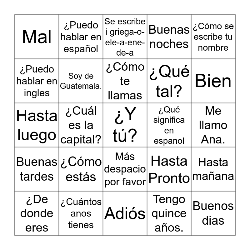 This bingo card has a free space and 24 words: ¿Cómo estás, ¿Cuántos anos tienes, ¿Cómo te llamas, ¿De donde eres, ¿Cómo se escribe tu nombre, Mal, ¿Puedo hablar en ingles, ¿Puedo hablar en español, ¿Qué significa en espanol, Más despacio por favor, ¿Qué tal?, Hasta luego, Hasta Pronto, Hasta mañana, Soy de Guatemala., Tengo quince años., Me llamo Ana., Se escribe i griega-o-ele-a-ene-de-a, Bien, ¿Cuál es la capital?, Buenos dias, Buenas tardes, Buenas noches and Adiós.