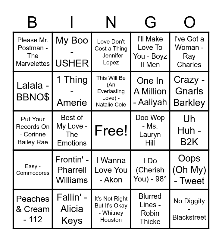 This bingo card has a free space and 97 words: Family Affair - Mary J. Blige, Candy Rain - Soul For Real, Blame It - Jamie Foxx, Best of My Love - The Emotions, Rolling in the Deep - Adele, Killing Me Softly With His Song - Fugees, Snooze - SZA, Ms. Jackson - Outkast, Thinkin Bout You - Frank Ocean, No Role Modelz - J. Cole, Do You Love Me - The Contours, Blinding Lights - The Weeknd, I Will Survive - Gloria Gaynor, Easy - Commodores, Unwritten - Natasha Bedingfield, Please Mr. Postman - The Marvelettes, I've Got a Woman - Ray Charles, Move Ya Body - Nina Sky, Feels Good - Tony! Toni! Toné!, Always On Time - Ja Rule, He Wasn't Man Enough - Toni Braxton, Halo - Beyoncé, We Belong Together - Mariah Carey, All Night Long - Lionel Richie, I Want You Back - The Jackson 5, This Will Be (An Everlasting Love) - Natalie Cole, Peaches & Cream - 112, Oops (Oh My) - Tweet, Trip - Ella Mai, Lady - D'Angelo, 1 Thing - Amerie, I'll Make Love To You - Boyz II Men, Finesse - Bruno Mars, So Sick - Ne-Yo, It's Not Right But It's Okay - Whitney Houston, I Wanna Love You - Akon, Buy U a Drank - T-Pain, Trick Me Radio Mix - Kelis, All For You - Janet Jackson, Put Your Records On - Corinne Bailey Rae, Super Freak - Rick James, Uh Huh - B2K, Heard It Through The Grapevine - Marvin Gaye, Blurred Lines - Robin Thicke, Frontin' - Pharrell Williams, Somebody's Watching Me - Rockwell, No Scrubs - TLC, Back To Black - Amy Winehouse, Love Like This - Faith Evans, I Just Wanna Love U - JAY-Z, The Way I Are Timbaland, How Do I Breathe - Mario, Stop! In The Name Of Love - The Supremes, Never Leave You - Lumidee, My Girl - The Temptations, Don't Let Go - En Vogue, At Last - Etta James, My Boo - USHER, Yo - Chris Brown, Poison - Bell Biv DeVoe, 1 2 Step - Ciara, What You Want - Mase, Signed Sealed Delivered - Stevie Wonder, Forever Your Girl - Paula Abdul, Stay With Me - Sam Smith, Where the Party At - Jagged Edge, Glamorous - Fergie, Just the Two of Us - Grover Washington, Genie In a Bottle - Christina Aguilera, Fallin' - Alicia Keys, One In A Million - Aaliyah, The Boy Is Mine - Brandy, This Is How We Do It - Montell Jordan, Redbone - Childish Gambino, MILLION DOLLAR BABY - Tommy Richman, Dilemma - Nelly, Say My Name - Destiny's Child, Love On The Brain - Rihanna, Doo Wop - Ms. Lauryn Hill, Work It - Missy Elliott, Water - Tyla, Crazy - Gnarls Barkley, Billie Jean - Michael Jackson, September - Earth Wind & Fire, Location - Khalid, Don't Wanna Go Home - Jason Derulo, No Diggity - Blackstreet, Love Machine - The Miracles, Bad Habit - Steve Lacy, ocean eyes - Billie Eilish, Love Don't Cost a Thing - Jennifer Lopez, Upside Down - Diana Ross, I've Got the Music in Me - Kiki Dee, I Do (Cherish You) - 98°, Lalala - BBNO$, Dancing In The Street - Martha & The Vandellas and Respect - Aretha Franklin.