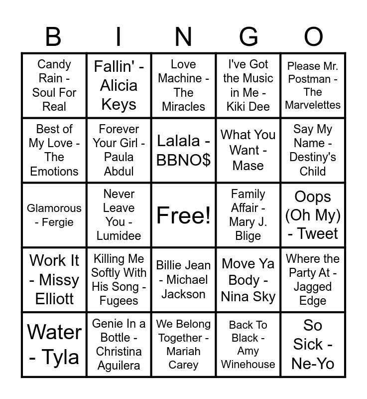 This bingo card has a free space and 97 words: Heard It Through The Grapevine - Marvin Gaye, Lady - D'Angelo, Finesse - Bruno Mars, Never Leave You - Lumidee, Respect - Aretha Franklin, I Wanna Love You - Akon, This Is How We Do It - Montell Jordan, Thinkin Bout You - Frank Ocean, Don't Let Go - En Vogue, Poison - Bell Biv DeVoe, The Boy Is Mine - Brandy, Feels Good - Tony! Toni! Toné!, Uh Huh - B2K, Work It - Missy Elliott, I Just Wanna Love U - JAY-Z, Candy Rain - Soul For Real, Please Mr. Postman - The Marvelettes, Ms. Jackson - Outkast, Peaches & Cream - 112, No Scrubs - TLC, 1 Thing - Amerie, Always On Time - Ja Rule, All Night Long - Lionel Richie, I've Got a Woman - Ray Charles, Easy - Commodores, Lalala - BBNO$, Water - Tyla, Where the Party At - Jagged Edge, Blinding Lights - The Weeknd, Dilemma - Nelly, Forever Your Girl - Paula Abdul, I've Got the Music in Me - Kiki Dee, It's Not Right But It's Okay - Whitney Houston, September - Earth Wind & Fire, We Belong Together - Mariah Carey, Billie Jean - Michael Jackson, My Girl - The Temptations, Put Your Records On - Corinne Bailey Rae, Love On The Brain - Rihanna, Glamorous - Fergie, Bad Habit - Steve Lacy, Oops (Oh My) - Tweet, Doo Wop - Ms. Lauryn Hill, Back To Black - Amy Winehouse, Killing Me Softly With His Song - Fugees, My Boo - USHER, Crazy - Gnarls Barkley, Blame It - Jamie Foxx, I'll Make Love To You - Boyz II Men, Buy U a Drank - T-Pain, 1 2 Step - Ciara, Stop! In The Name Of Love - The Supremes, I Do (Cherish You) - 98°, Dancing In The Street - Martha & The Vandellas, Trip - Ella Mai, MILLION DOLLAR BABY - Tommy Richman, Unwritten - Natasha Bedingfield, Fallin' - Alicia Keys, Super Freak - Rick James, All For You - Janet Jackson, Somebody's Watching Me - Rockwell, Stay With Me - Sam Smith, He Wasn't Man Enough - Toni Braxton, Location - Khalid, This Will Be (An Everlasting Love) - Natalie Cole, Trick Me Radio Mix - Kelis, Blurred Lines - Robin Thicke, How Do I Breathe - Mario, Love Don't Cost a Thing - Jennifer Lopez, Genie In a Bottle - Christina Aguilera, What You Want - Mase, Redbone - Childish Gambino, Halo - Beyoncé, ocean eyes - Billie Eilish, No Diggity - Blackstreet, Upside Down - Diana Ross, One In A Million - Aaliyah, Snooze - SZA, Family Affair - Mary J. Blige, Frontin' - Pharrell Williams, Do You Love Me - The Contours, Say My Name - Destiny's Child, No Role Modelz - J. Cole, At Last - Etta James, Rolling in the Deep - Adele, Love Like This - Faith Evans, So Sick - Ne-Yo, Don't Wanna Go Home - Jason Derulo, Signed Sealed Delivered - Stevie Wonder, I Want You Back - The Jackson 5, Love Machine - The Miracles, I Will Survive - Gloria Gaynor, Yo - Chris Brown, Move Ya Body - Nina Sky, Best of My Love - The Emotions, The Way I Are Timbaland and Just the Two of Us - Grover Washington.