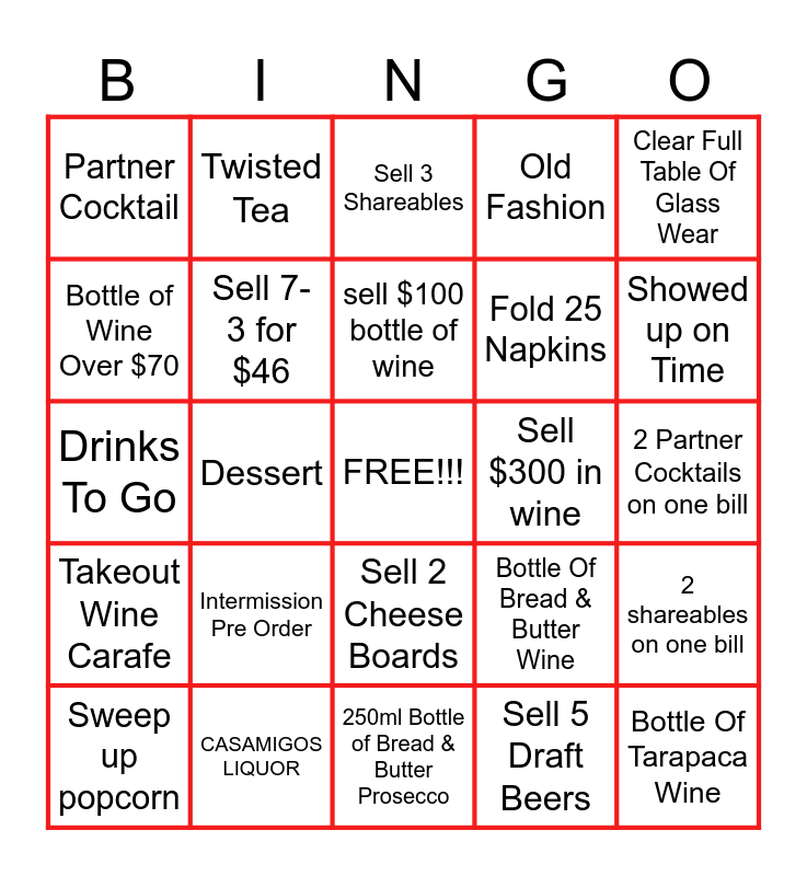 This bingo card has a free space and 29 words: Sweep up popcorn, Bottle of Bolla PG Wine, Dessert, Double Cocktail, Partner Cocktail, Sell 3 Shareables, Sell 7- 3 for $46, Intermission Pre Order, Sell $300 in wine, CASAMIGOS LIQUOR, 2 Partner Cocktails on one bill, Bottle Of Tarapaca Wine, 250ml Bottle of Bread & Butter Prosecco, Sell 5 Draft Beers, Showed up on Time, Old Fashion, Sell 2 Cheese Boards, Takeout Wine Carafe, Clear Full Table Of Glass Wear, Drinks To Go, Bottle Of Bread & Butter Wine, Espresso Martini, Fold 25 Napkins, Bottle of Wine Over $70, Old Fashion, Twisted Tea, 2 shareables on one bill, sell $100 bottle of wine and Strongbow.