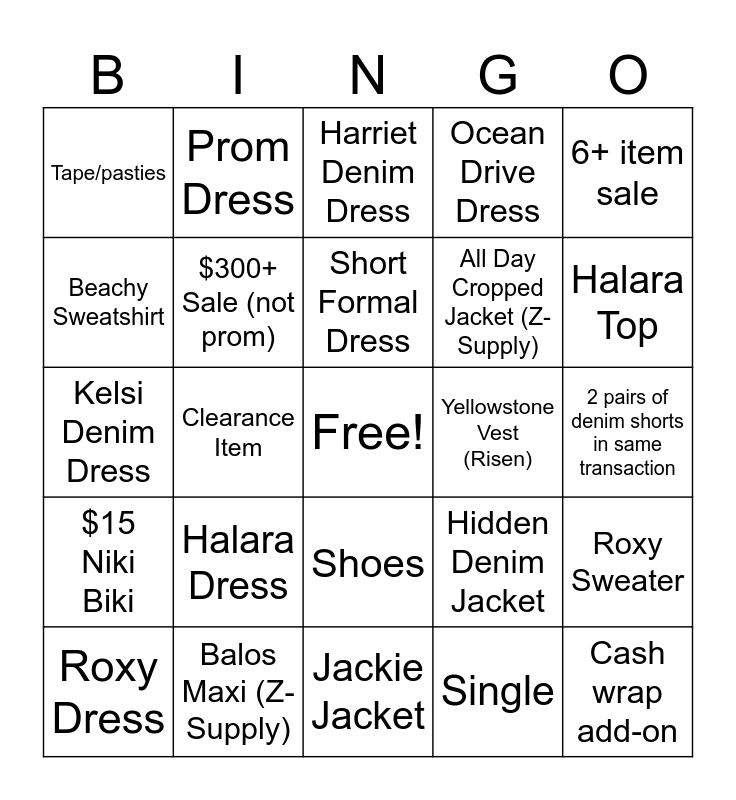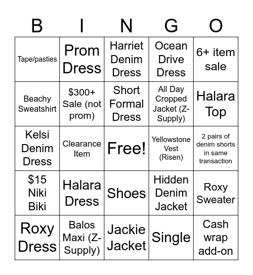 This bingo card has a free space and 24 words: Halara Dress, Balos Maxi (Z-Supply), Short Formal Dress, Roxy Dress, 6+ item sale, Tape/pasties, Beachy Sweatshirt, Prom Dress, Yellowstone Vest (Risen), Shoes, All Day Cropped Jacket (Z-Supply), Kelsi Denim Dress, Hidden Denim Jacket, Roxy Sweater, $300+ Sale (not prom), Single, 2 pairs of denim shorts in same transaction, Harriet Denim Dress, Halara Top, Clearance Item, Cash wrap add-on, $15 Niki Biki, Ocean Drive Dress and Jackie Jacket.