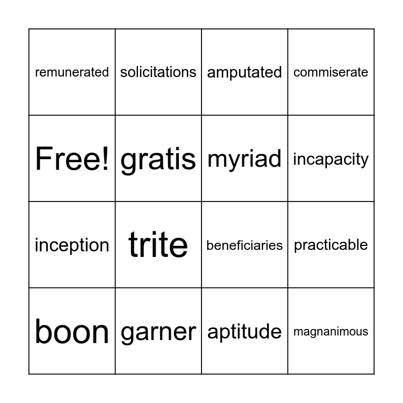 This bingo card has 16 words: garner, practicable, amputated, remunerated, inception, solicitations, beneficiaries, aptitude, Free!, gratis, boon, commiserate, trite, incapacity, myriad and magnanimous.