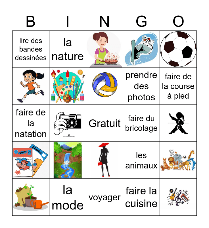 This bingo card has 22 images, a free space and 15 words: faire du bricolage, lire des bandes dessinées, faire de la course à pied, voyager, la musique, faire la cuisine, la nature, jouer au soccer, faire du jardinage, les arts, la mode, faire de la natation, les animaux, prendre des photos and faire de la bicyclette.