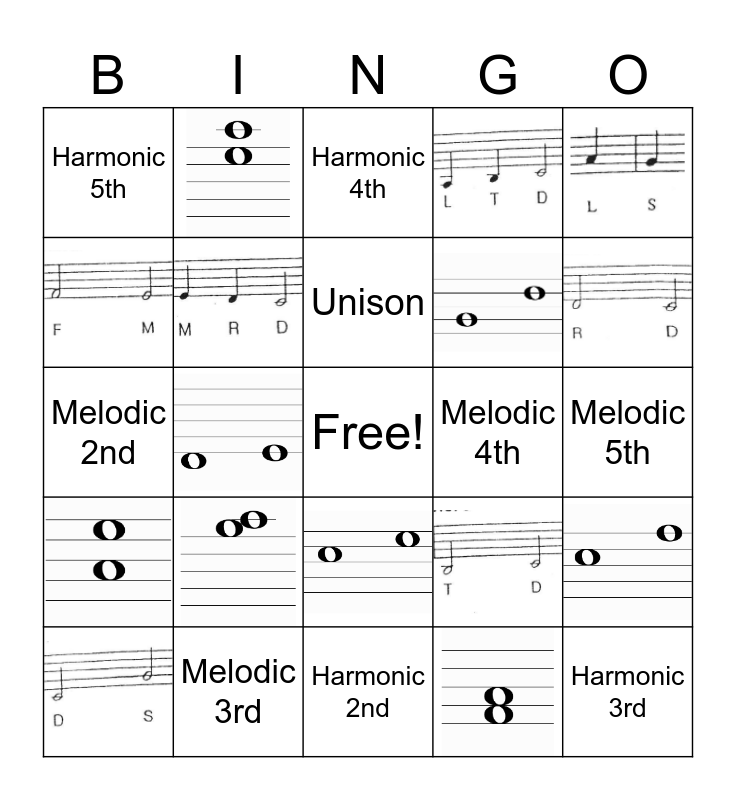 This bingo card has 15 images, a free space and 9 words: Melodic 3rd, Unison, Harmonic 5th, Melodic 4th, Melodic 2nd, Melodic 5th, Harmonic 4th, Harmonic 3rd and Harmonic 2nd.